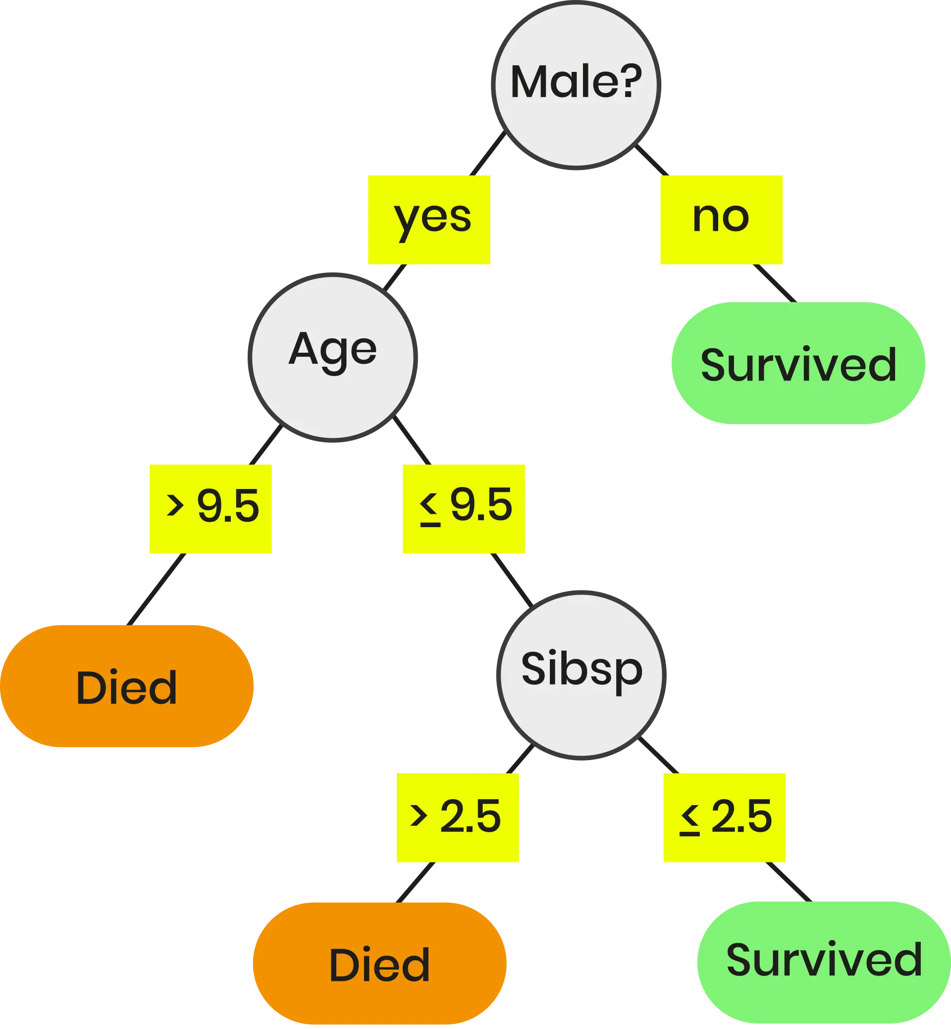 Árbol de decisión para clasificación de supervivientes del Titanic según su sexo (Male?), edad (Age) y número de hermanos (Sibsp).