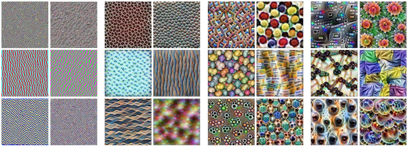 Visualización de los patrones aprendidos por un modelo de clasificación de imagen. Las imágenes más a la izquierda corresponden a capas más iniciales (los patrones crecen en complejidad en capas más profundas). Estos patrones pueden ser útiles para clasificar nuevas categorías de imágenes, justificando intuitivamente el aprendizaje por transferencia. Fuente: https://distill.pub/2017/feature- visualization/ (lectura recomendada).